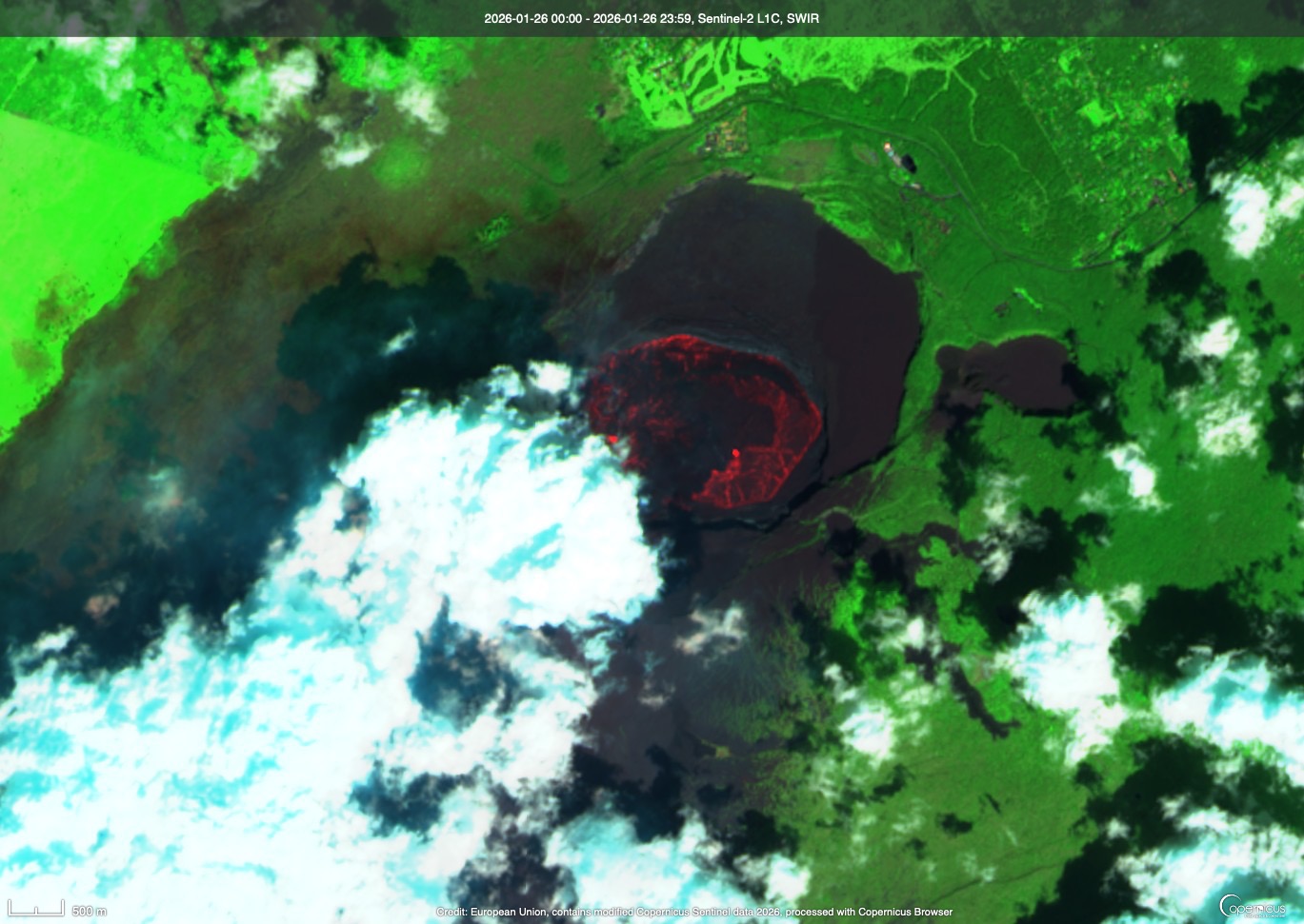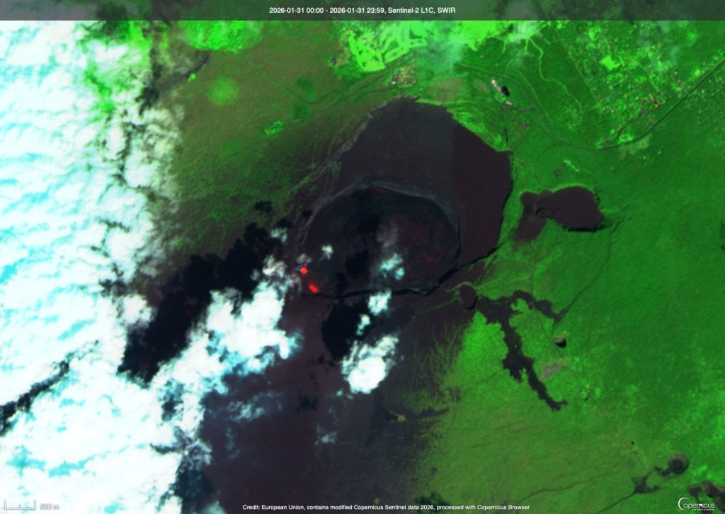 These two images aren’t from this week but rather last week, but show how Kīlauea’s summit crater changes after an eruptive episode. The first shot was taken on January 25, 2026. It is an infrared image where the hot areas in the crater glow red. This was just after the latest eruptive episode ended and the new lava flows are quite evident.