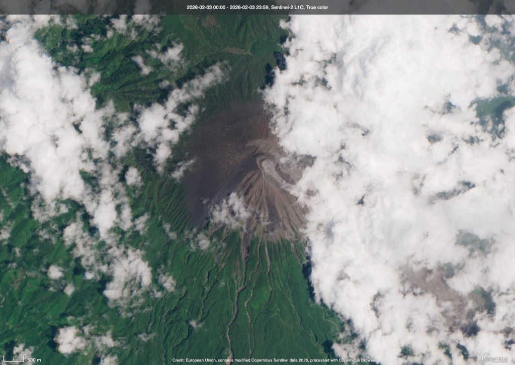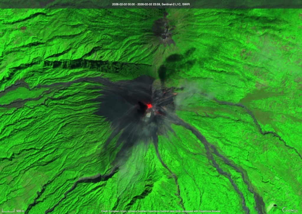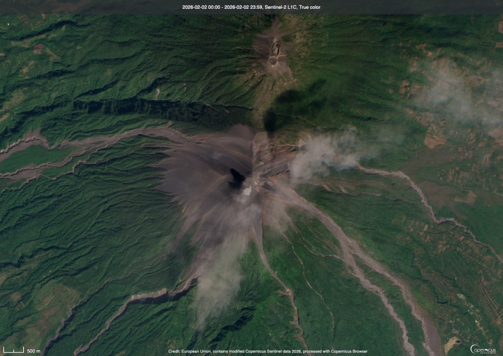 The perennially-active Fuego in Guatemala continues to be just that: active. A small plume of ash can be spotted near the summit in this February 2, 2026 image. Actually, the shadow from the plume on the left side of the summit is much easier to see than the plume itself.