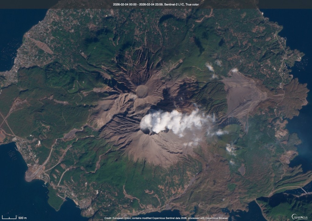 Sometimes volcanoes just “shoot well” from space. Sakurajima in Kagoshima Bay in Japan really sparkles when it is clear like it was on February 4, 2026. The two craters on the volcano — Showa and Mindakeshima — are clearly visible, although the Mindakeshima crater has a vigorous volcanic gas plume. Most of the material in that plume is water vapour, carbon dioxide and other gases (with maybe a smidge of ash). Sidenote: I’ve always been found not the lava flow that heads off to the east (right) of the main summit into the bay. It makes a lovely lava delta. Many people think Sakurajima is the main volcano here, but it actually is just part of the larger Aira Caldera.