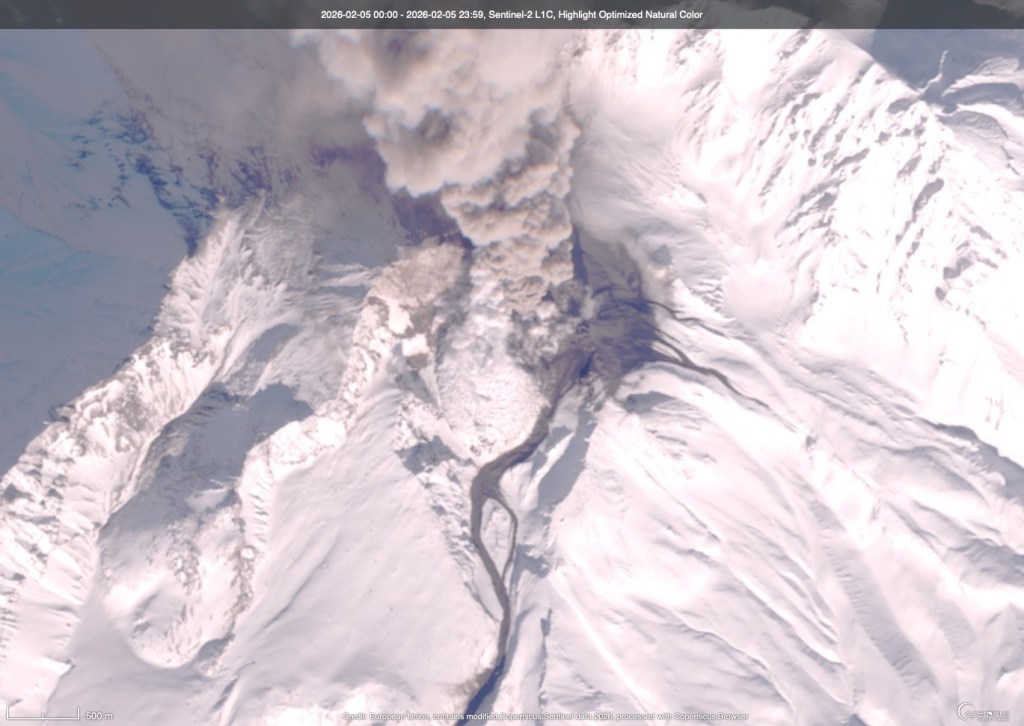 First up, here is a shot of Shiveluch from February 5, 2026. There is a healthy plume of light grey ash and volcanic gases spreading towards the top of the image. Most strikingly (to me) there is a thin ribbon of a lahar (volcanic mudflow) heading down from the dome complex into the carved-out crater of the volcano.